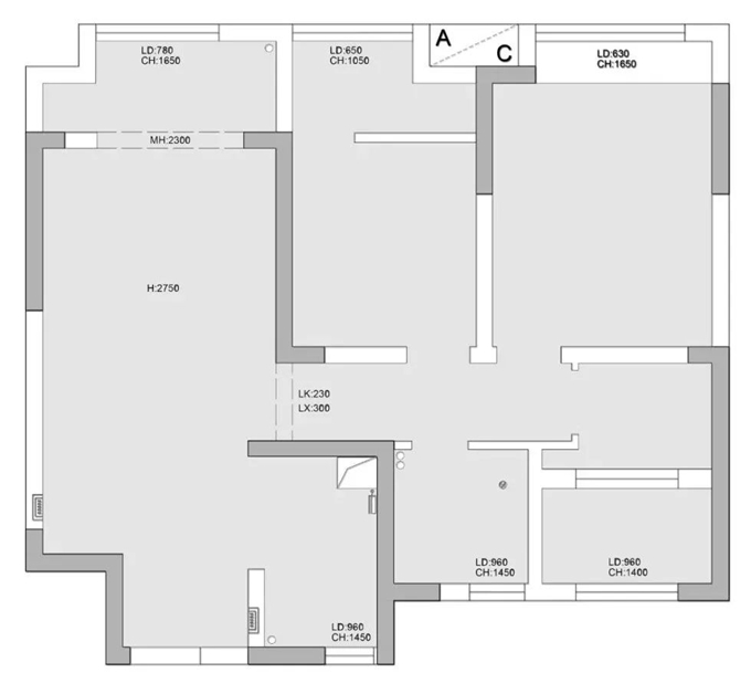 設(shè)計(jì)理念:拿到戶型的時(shí)候,算是對(duì)于剛需來(lái)說(shuō)規(guī)劃的還比較合理的三居室,這樣的戶型也很常見(jiàn),由于業(yè)主的需求不是太剛需,暫時(shí)這房子是作為90后小兩口的過(guò)渡房,希望以享受當(dāng)下為主,考慮寶寶的時(shí)候再置換改善性房,這套房子就留給父母親居住。