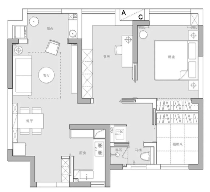 圖2.戶型改造:1、我們將利用鞋柜的柜體和削薄墻體,利用第一扇內(nèi)嵌門(mén),能保證過(guò)道的寬度,鞋柜的正常深度和廚房的空間利用最大化;2、我們利用第二扇內(nèi)嵌門(mén),將衛(wèi)生間改造成干濕分離,原本以為淋浴空間比較小,現(xiàn)場(chǎng)的實(shí)際感受也比較舒適;3、我們利用第三扇內(nèi)嵌門(mén),將北面的小房間打造成榻榻米房,業(yè)主說(shuō)冬天的時(shí)候坐在榻榻米上泡腳就近衛(wèi)生間應(yīng)該是一件很享受的事情;4、我們利用第四扇內(nèi)嵌門(mén),打造了小兩口的書(shū)房和臥室的套間;5、我們利用第五扇內(nèi)嵌門(mén),打造了臥室和書(shū)房可開(kāi)可合的空間。
