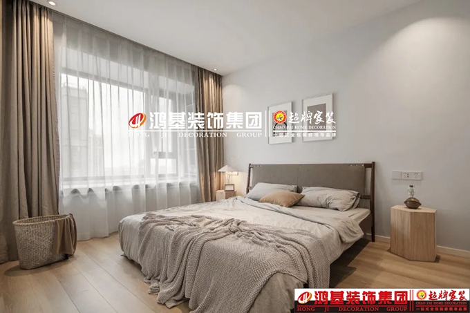 主臥,極簡(jiǎn)的墻頂面設(shè)計(jì)搭配原木地板,裝飾畫(huà)修飾床背景,灰褐色大床搭配卡其窗簾,低飽和的色彩制造舒眠環(huán)境。